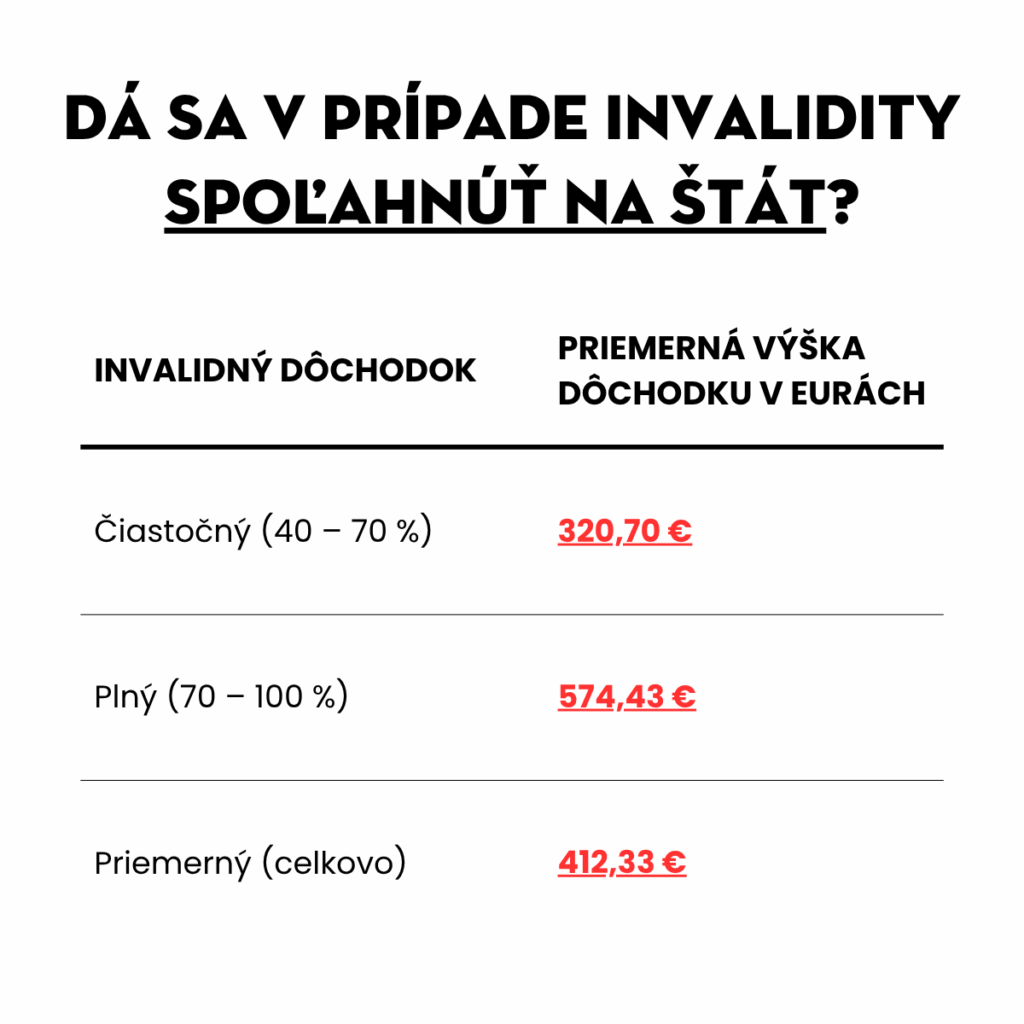 Najväčší problém, ktorý nám hrozí, je, ak choroba (95 % prípadov) alebo úraz (5 % prípadov) spôsobí, že sa staneme invalidnými a nebudeme vedieť dočasne alebo dlhodobo pracovať – teda náš príjem poklesne na úplné minimum (invalidný dôchodok).